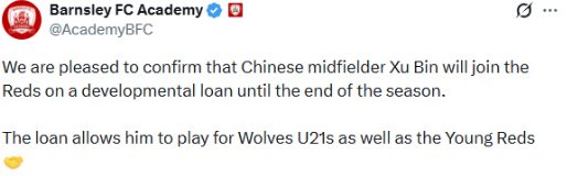 博主敖铭则表示,“徐彬既可以为巴恩斯利U21踢比赛,也可以为狼队U21踢比赛,但仅限U21比赛,确实本赛季暂时是踢不上英甲联赛的。狼队的公告其实也是斟字酌句,不想引发国内球迷过度的期望。大家还是冷静一下吧,英超遥不可及。未来如果在某个赛季的足总杯,看到低级别球队中有中国球员出场,那已经很棒了。”